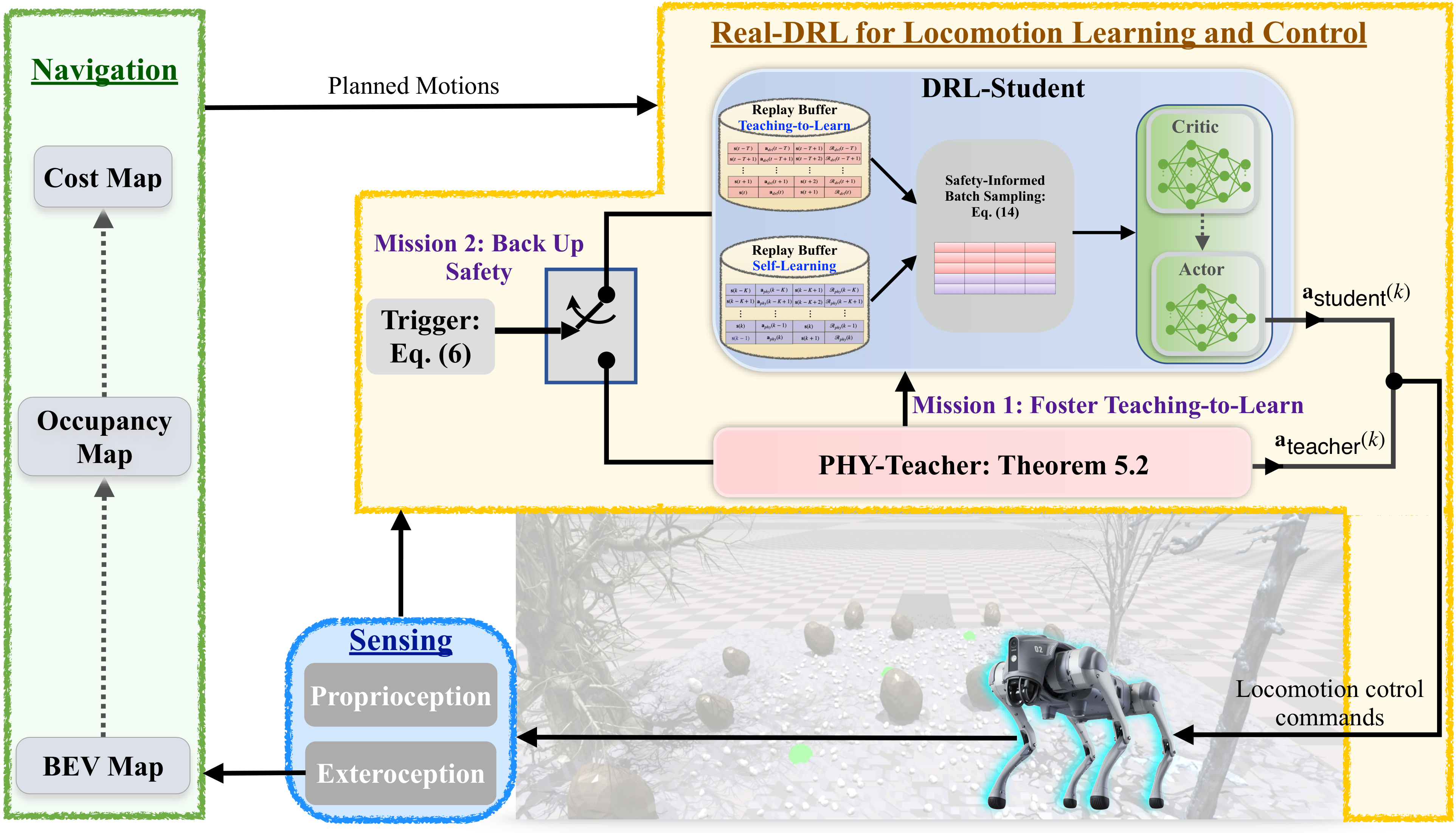 The Real-DRL framework is designed for safety-critical autonomous systems, enabling runtime learning of a deep reinforcement learning (DRL) agent to develop safe and high-performance action policies in real plants (i.e., real physical systems to be controlled), while prioritizing safety! The Real-DRL consists of three interactive components: a DRL-Student, a PHY-Teacher, and a Trigger. The DRL-Student is a DRL agent that innovates in the dual self-learning and teaching-to-learn paradigm and the real-time safety-informed batch sampling. On the other hand, PHY-Teacher is a physics-model-based design of action policies that focuses solely on safety-critical functions. PHY-Teacher is novel in its real-time patch for two key missions: i). fostering the teaching-to-learn paradigm for DRL-Student and ii). backing up the safety of real plants. The Trigger manages the interaction between the DRL-Student and the PHY-Teacher. Powered by the three interactive components, the Real-DRL can effectively address safety challenges that arise from the unknown unknowns and the Sim2Real gap. Additionally, Real-DRL notably features i). assured safety, ii). automatic hierarchy learning (i.e., safety-first learning and then high-performance learning), and iii). safety-informed batch sampling to address the learning experience imbalance caused by corner cases. Experiments with a real quadruped robot, a quadruped robot in NVIDIA Isaac Gym, and a cart-pole system, along with comparisons and ablation studies, demonstrate the Real-DRL's effectiveness and unique features.